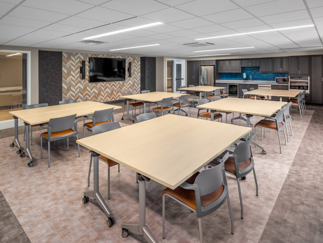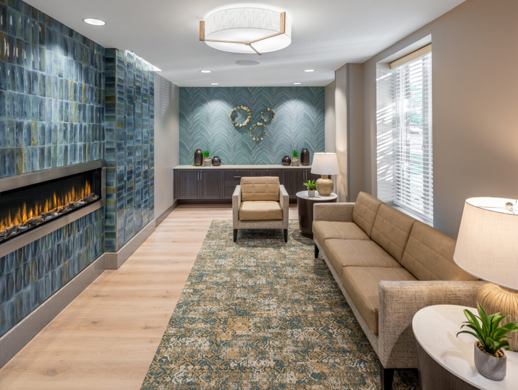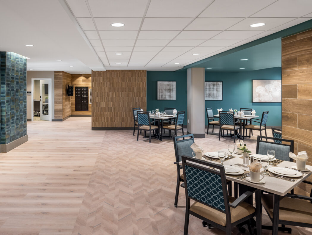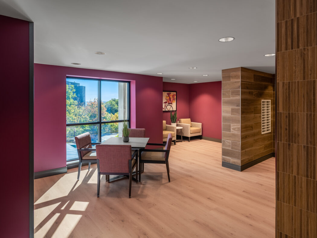 The renewed Greeno Assisted Living offers 61 assisted living apartments (1BR, 2BR, and Studios) with design features that accommodate mobility needs and encourage independence.  The resident dining experience has been elevated with a new kitchen for more extensive food preparation and a dining room zoned to create a more intimate, communal setting — a much-desired project goal fulfilled.