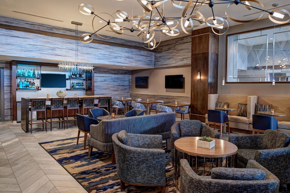 This 11-story, 290 room Marriott Hotel in Auburn Hills received a complete interior design makeover. The work included the guestrooms, great room, welcome zone, lobby vestibule, M Club, business center, front desk, elevator lobby, valet, restaurant, pool area, and event spaces.
