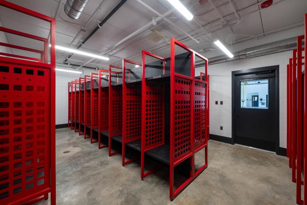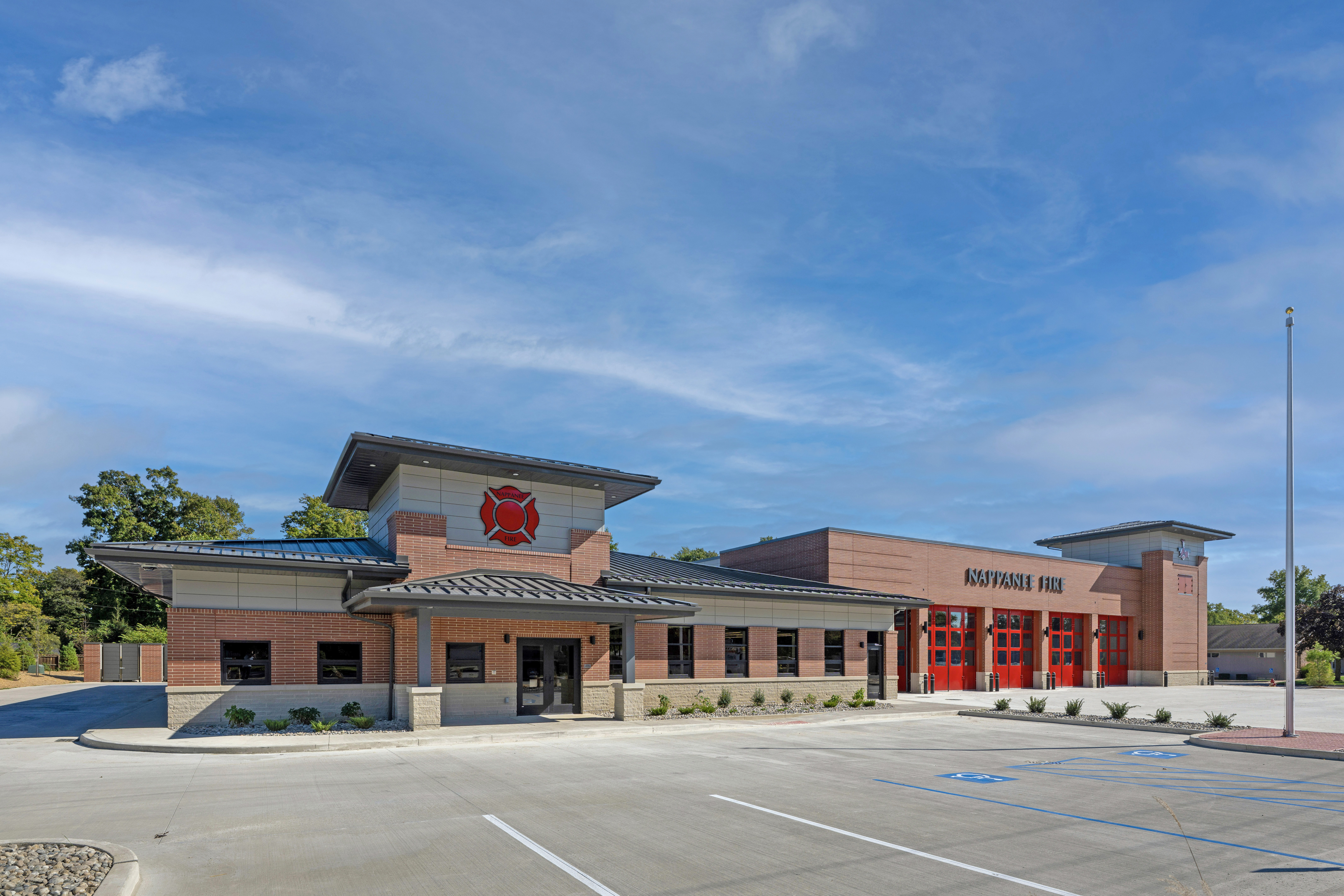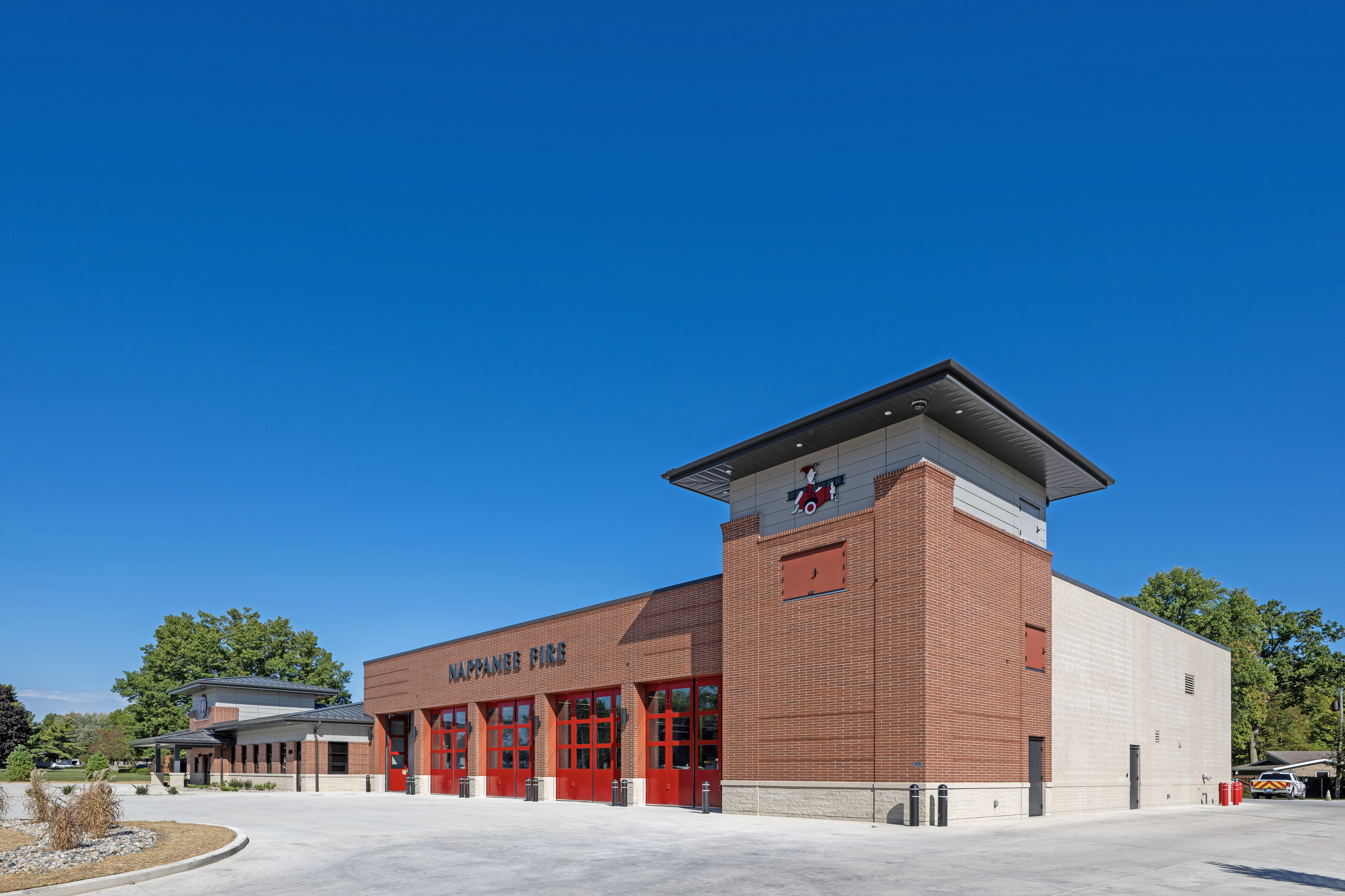 The new Nappanee Fire Station #1 consolidates first responders previously housed in three inadequate buildings—an EMS facility, a fire station, and living quarters in an old house—into a modern, efficient facility. Located on a two-acre site near commercial, residential, and church properties, the design carefully balances operational efficiency with neighborhood integration. A multi-use training and hose-drying tower at the southwest corner enhances firefighter training and equipment maintenance.