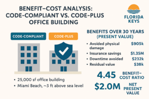 To understand the benefit of code-plus design, let’s model a 25,000sf office building in a high velocity wind zone that is 3 feet above sea level in Miami Beach. Code-plus design would include impact-rated openings, sealed roof deck and enhanced fasteners/straps, braced parapets and rooftop unit anchorage, elevated/protected MEP, backup power, envelope/MEP commissioning, and third-party verification (e.g., FORTIFIED Commercial).
